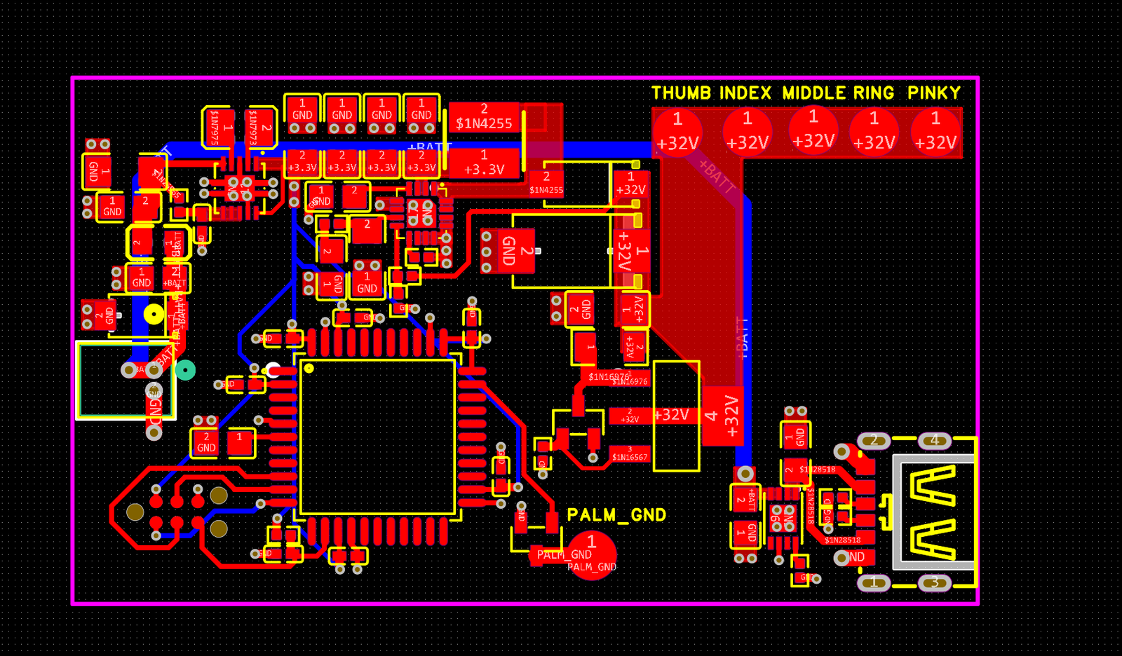 [Leon]’s TENS machine is specifically designed to help a relative with hand problems, so breaks out electrodes for each finger, with one on the palm serving as a common ground. This type of TENS is “monophasic”– that is, DC, which is easier than balancing current flowing in two directions through quivering flesh. The direct current is provided at 32 V to the digit electrodes, safely kept to a constant amperage with a transistor-based current limiting circuit. The common ground in the palm is pulsed at a rate set by an ATmega32U4 and thus controllable: 14 Hz is given as an example.