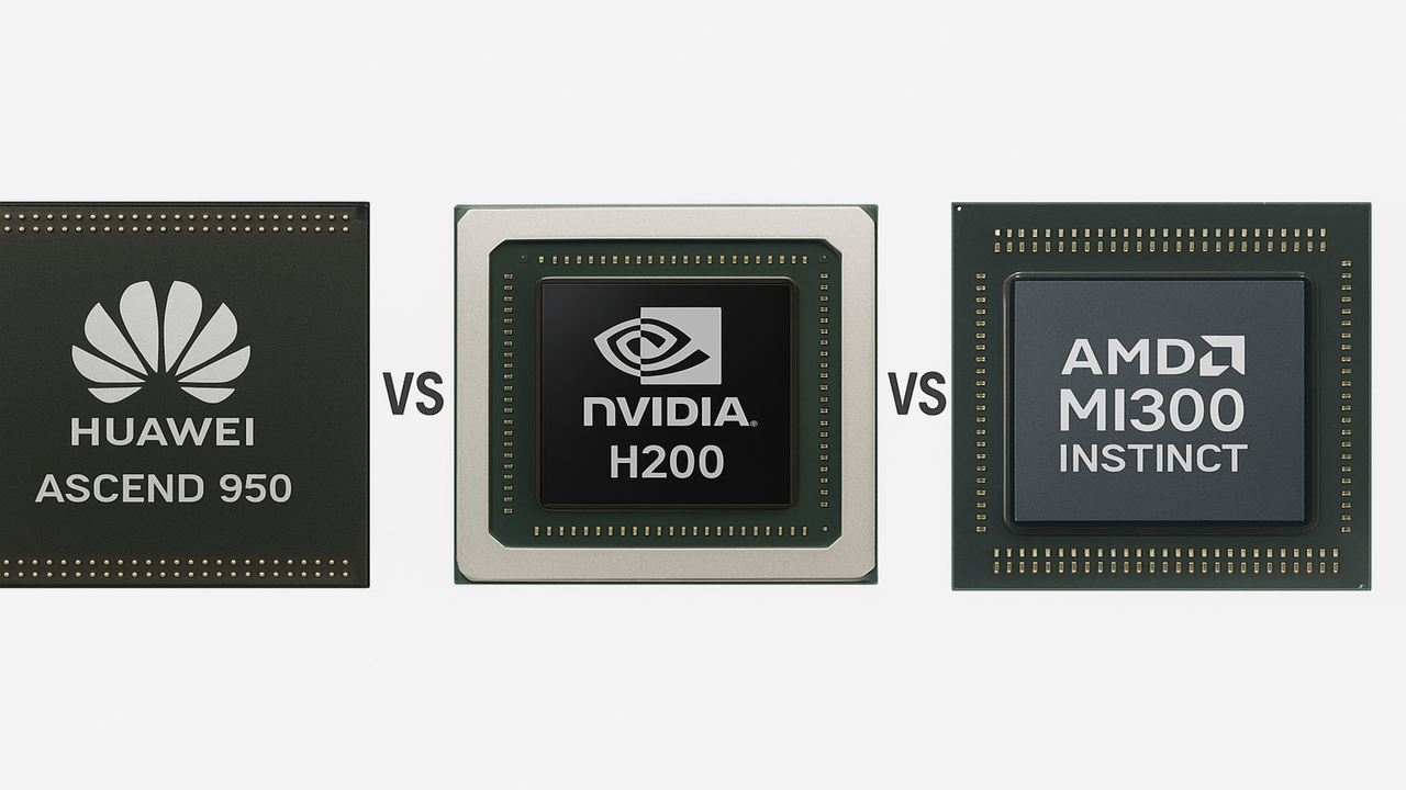 Different compute platform philosophies emerge as Ascend 950 targets low-precision efficiency, H200 leverages ecosystem maturity, and MI300 dominates memory bandwidth and FP64 performance.
