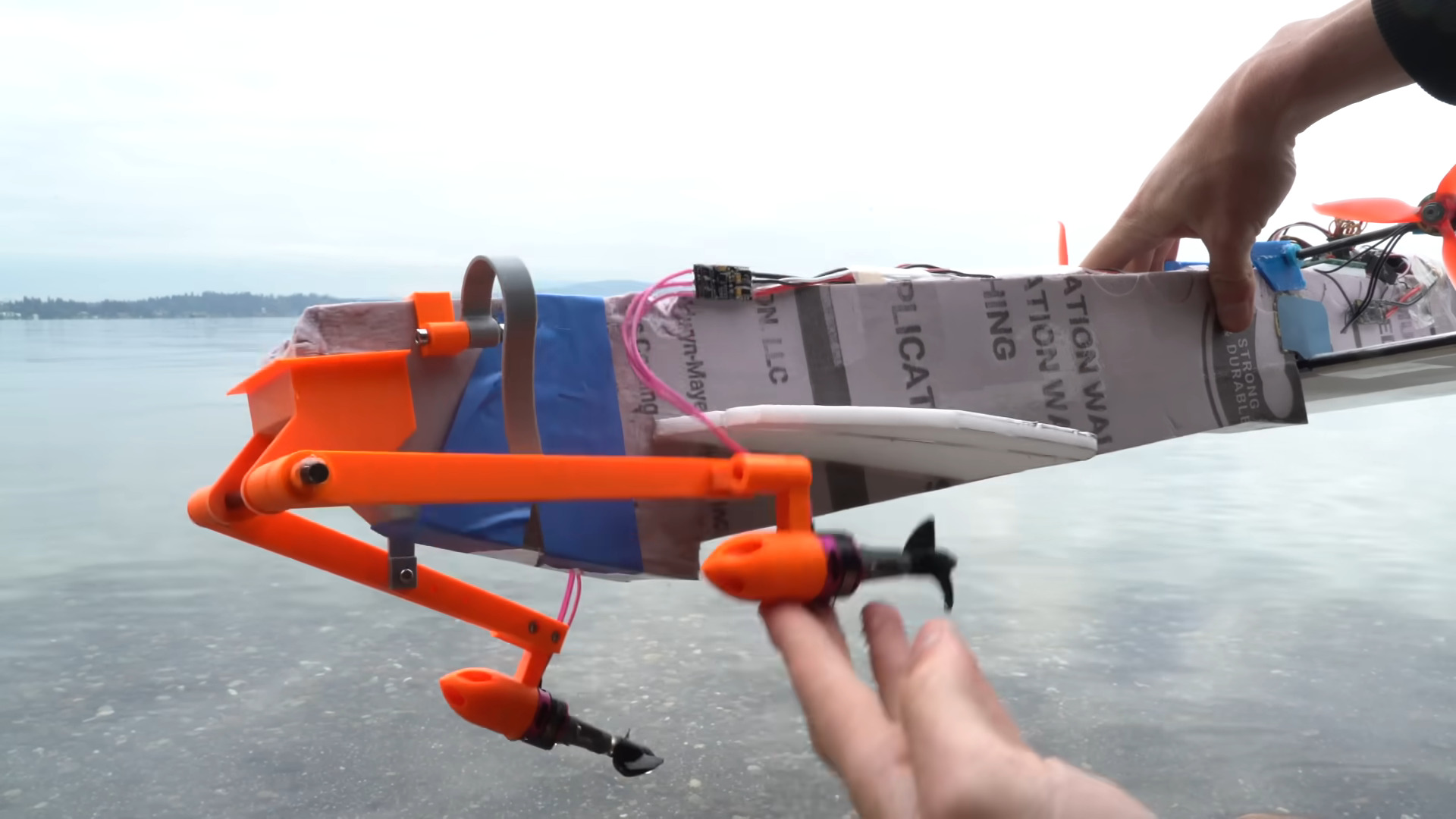 The next iteration of the design places a pair of hydro-screw propellers on the nose, for all the world like a pair of outboard motors. We’re not even sure what to call the resulting vehicle, but “more stable” is unfortunately not it. It doesn’t seem to fly any worse, mind you, but certainly not well enough to justify the complexity, especially once he goes down the rabbit hole of adding suspension to the motors.